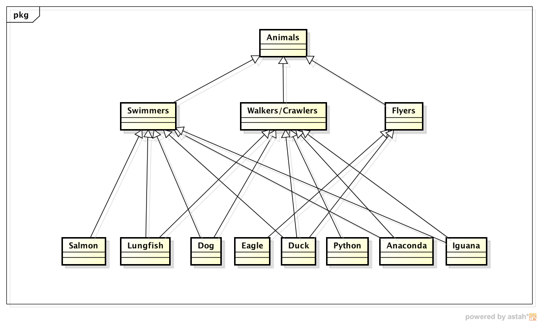 - Is it possible that an animal can be instantiated in different locations? (You’ll especially look to see that the duck can be instantiated as a swimmer, walker, or a flyer). That last bit was a little evil on my part. 🙂