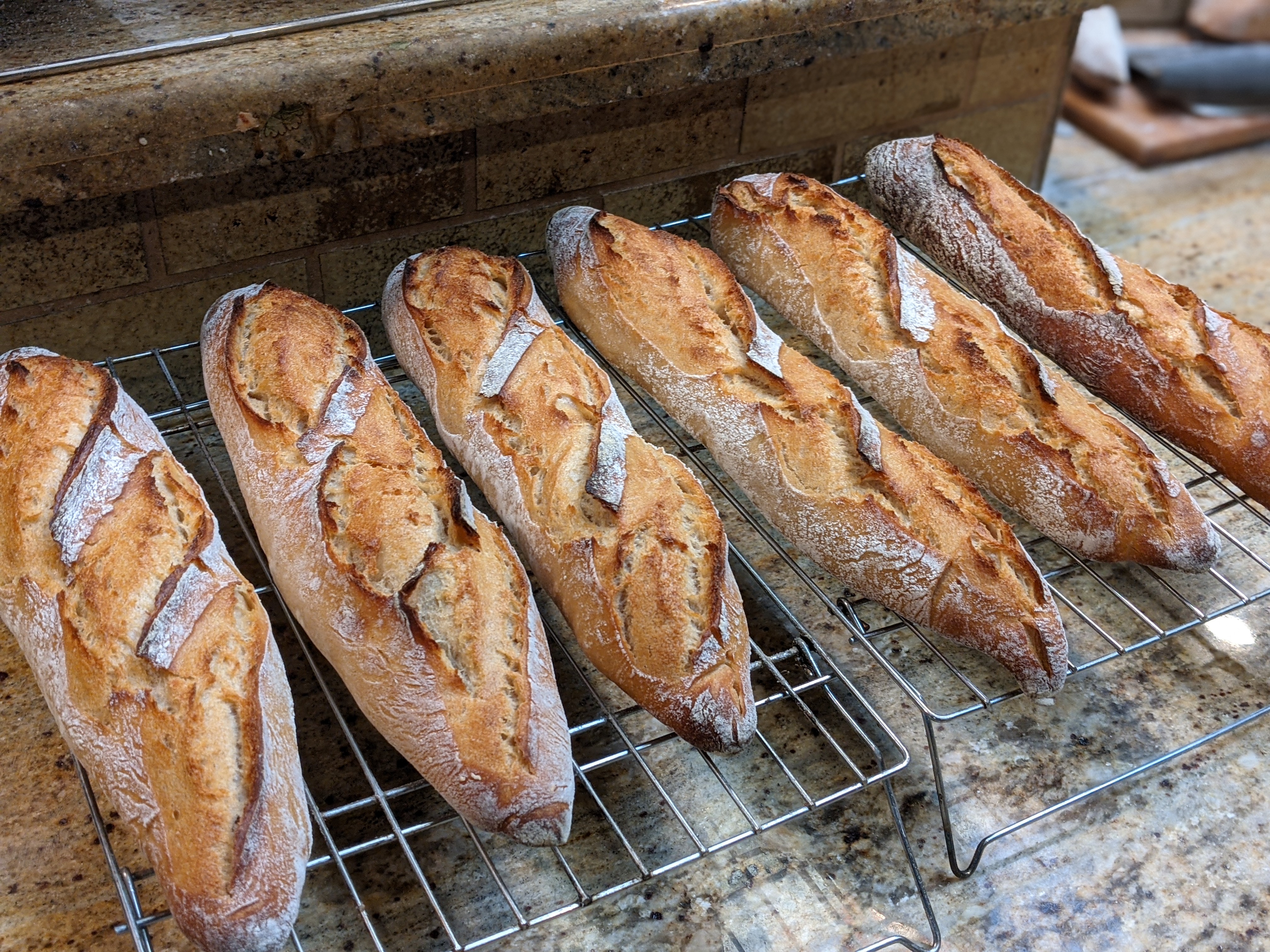Bake. Transfer loaves to a loading board or baguette pan. Score, then bake at 500°F for 8-10 minutes with steam (baguette should just start getting color). Remove your steaming container, then bake at 425°F for 12-15 minutes on convection if you have a convection setting, otherwise bake at 435°F for 12-15 minutes. Bake longer to a deep russet color, but beware that because of the acid in the dough, you don’t want to take these out too far as the crumb will dry if baked too long.