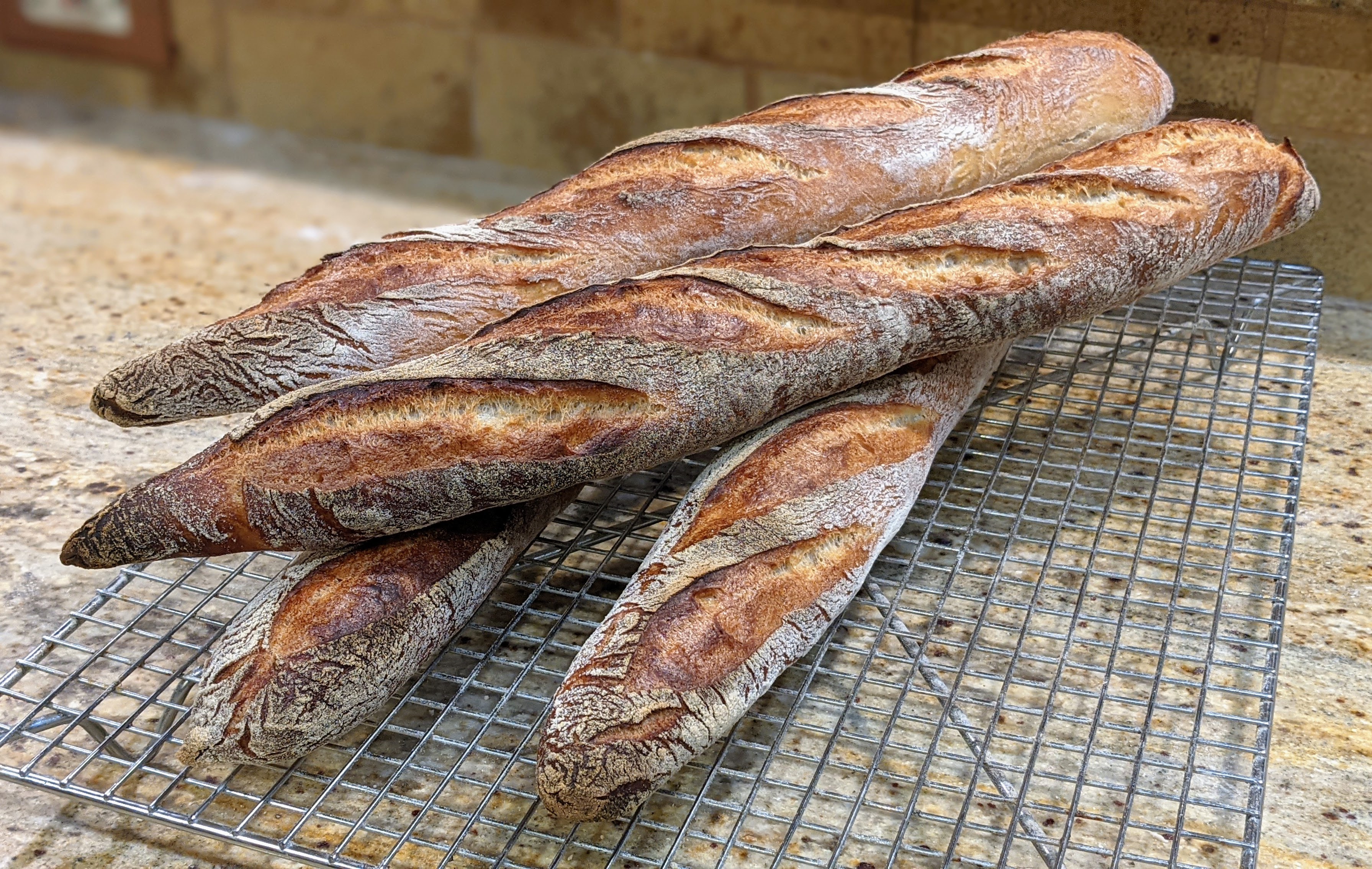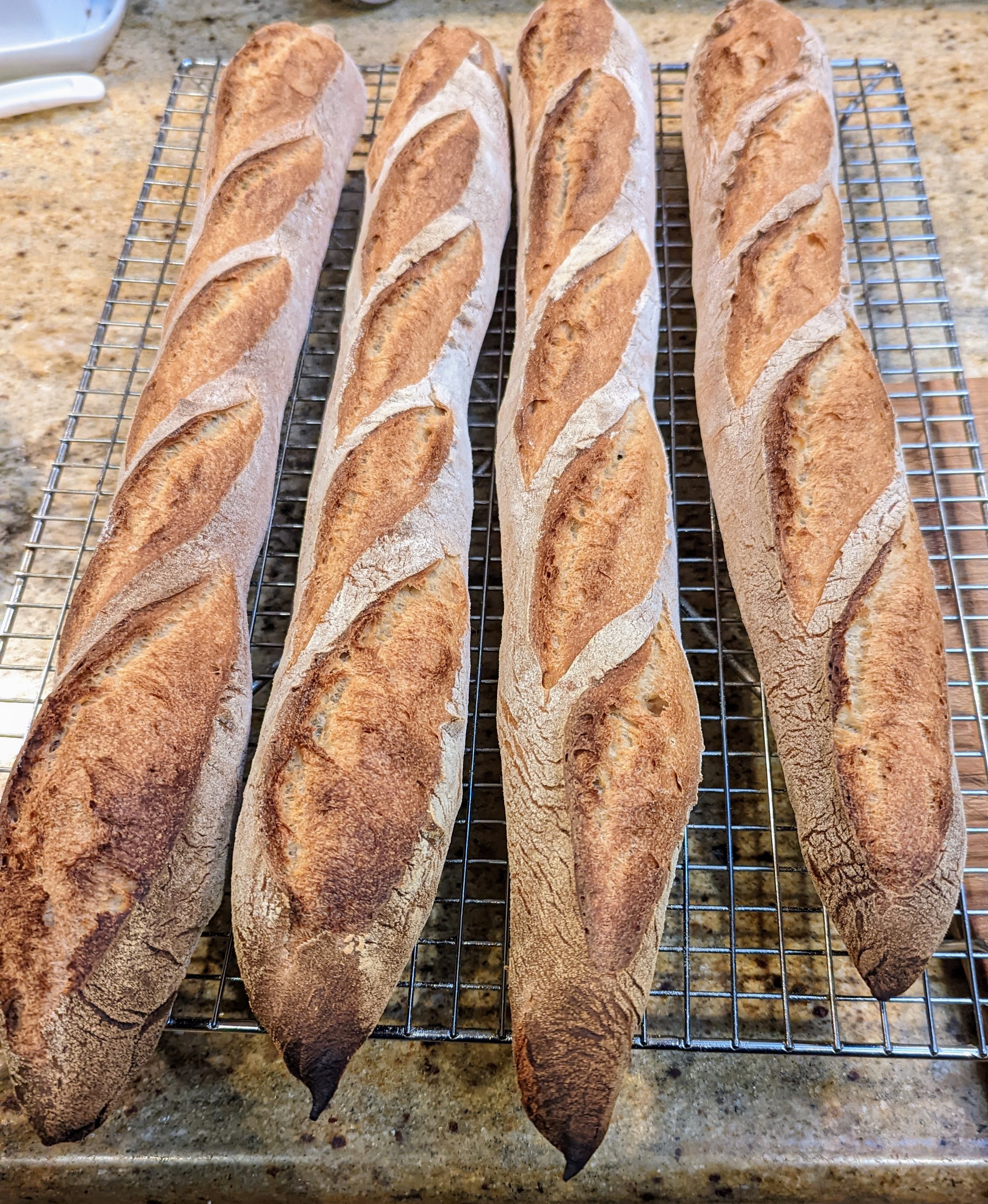 Update 9/4/2025 – To be honest, I never liked the low hydration of the dough because the texture of the crumb was more like traditional sourdough in that it was chewy. Baguette crumb should be chewy to some extent, but not nearly as toothsome as sourdough. So, I used the same technique but changed the hydration to the standard 75%. They’re much lighter with a nice, open crumb. Plus, I add a bit of diastatic malt powder (0.5%) to help soften both the crumb and crust.