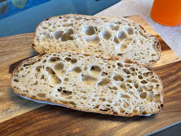 Today, I made a sourdough ciabatta (pictured above) and made a wonderful pulled pork sandwich with stinky Camembert cheese (if you can find Le Chatelin, it’s the best and the most stinky, yet flavorful Camembert). I sauced the meat with a light Kinder Gold BBQ sauce. It was spectacular. Sorry, I don’t have a picture of the sandwich because I forgot to take one. 🙂