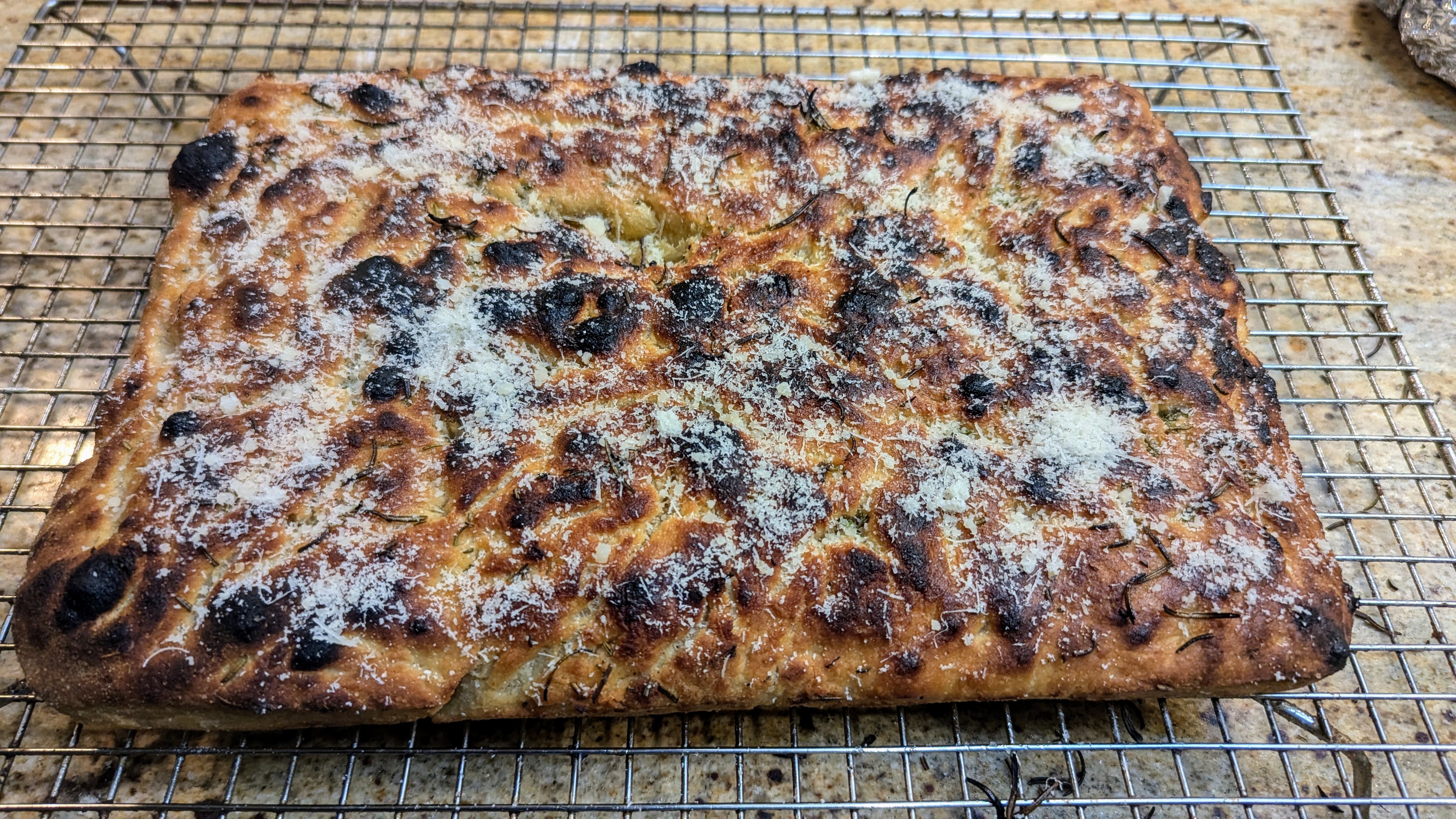 Final Fermentation. Punch down the dough, shape it into a rough rectangle in the shape of a 9″ X 13″ pan. Place into the pan, then use your fingers to spread out the dough and distribute it evenly in the pan. Let the dough rest for 20-30 minutes. After resting, sprinkle flaky salt on top and fresh rosemary all over the top. Sprinkle good extra virgin olive oil over the entire surface, then dimple the dough to let the oil pool in the dimples.