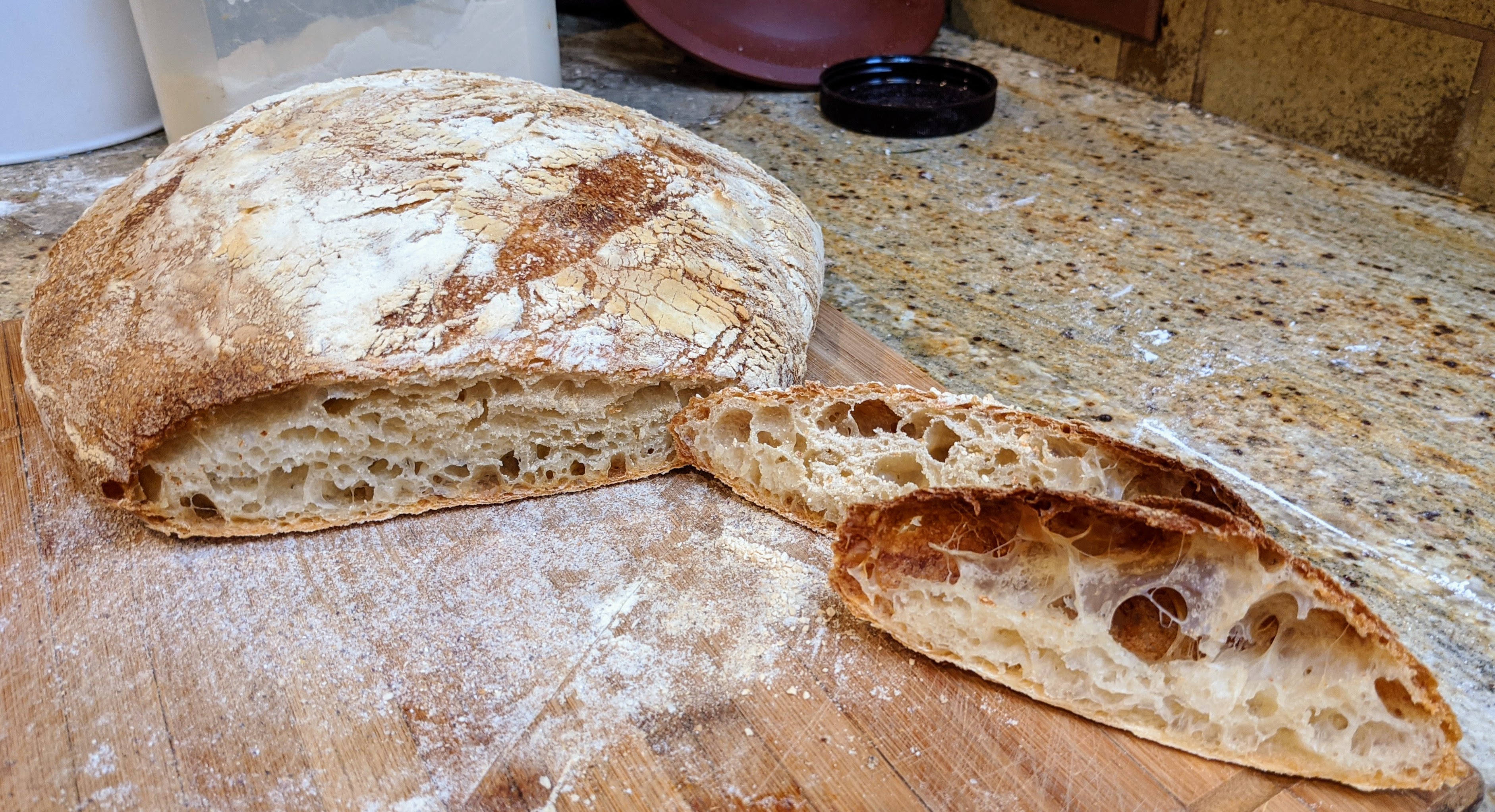 Why? Because they’re perfectly round and the bottom inch or so of those loaves are almost flat, which means the dough expanded all the way out to the edges of the Dutch oven and the only way for those loaves to expand is up. But if you take that same dough and put it on a stone, they won’t rise nearly as high, often resulting in a loaf similar to the flat loaf above.