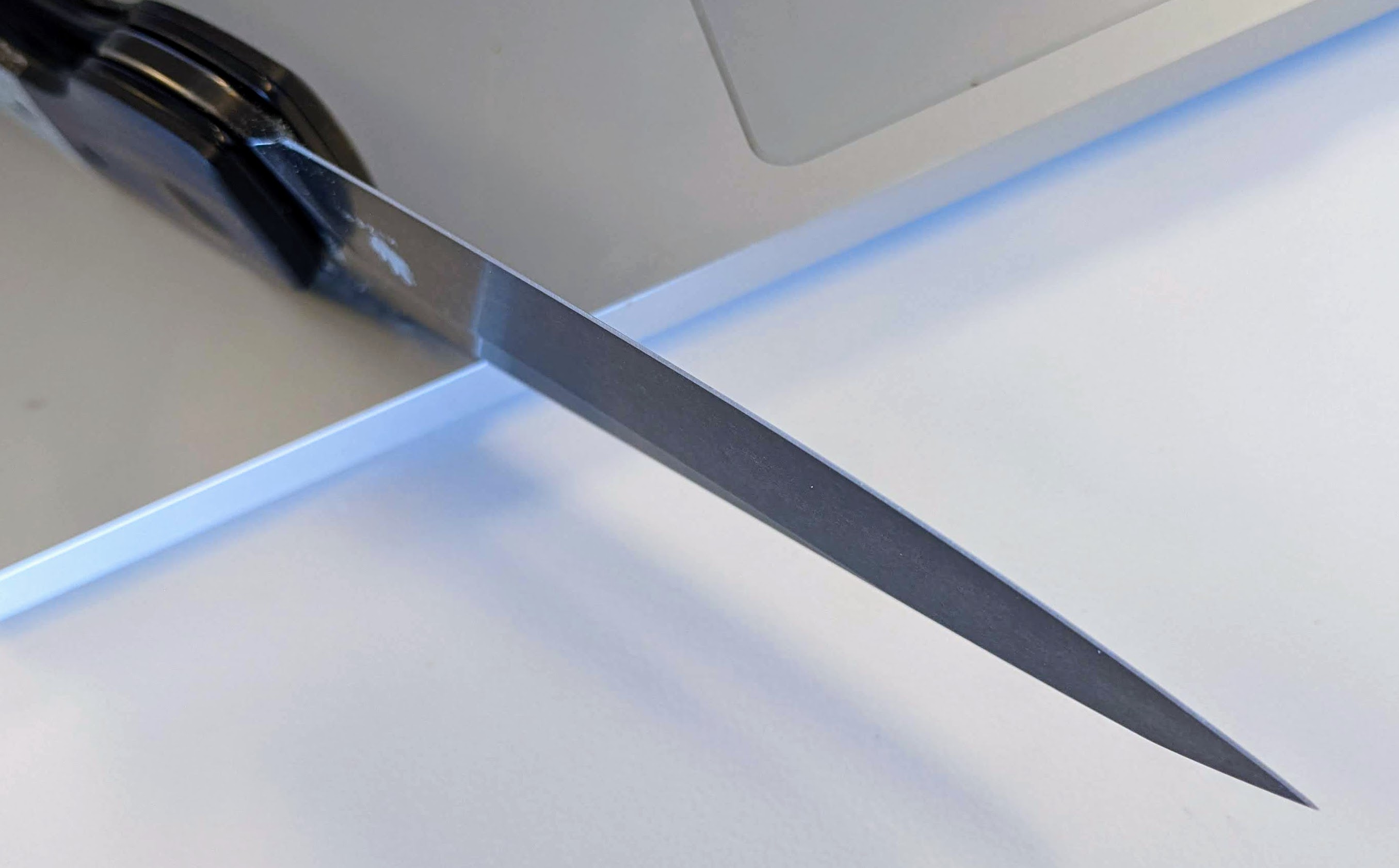 Thus far, I’ve used it to cut up heavy boxes, some vinyl tubing, and cutting up some old upholstery. It performed all those tasks amazingly well and still held a good edge. After each task, I just honed the blade on my ceramic rod and the edge came back to true real easy.
