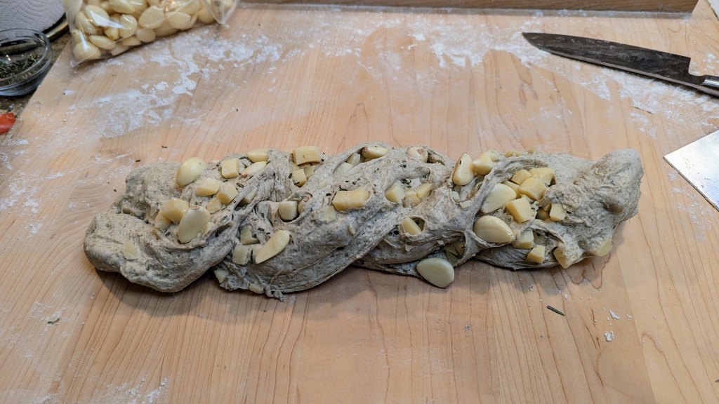 Normally, I’d include the whole garlic cloves, cheese, and rosemary in the overall formula and the final dough. But I’ve found that developing the dough first, then including the cheese and garlic when I’m shaping gives me much better results.