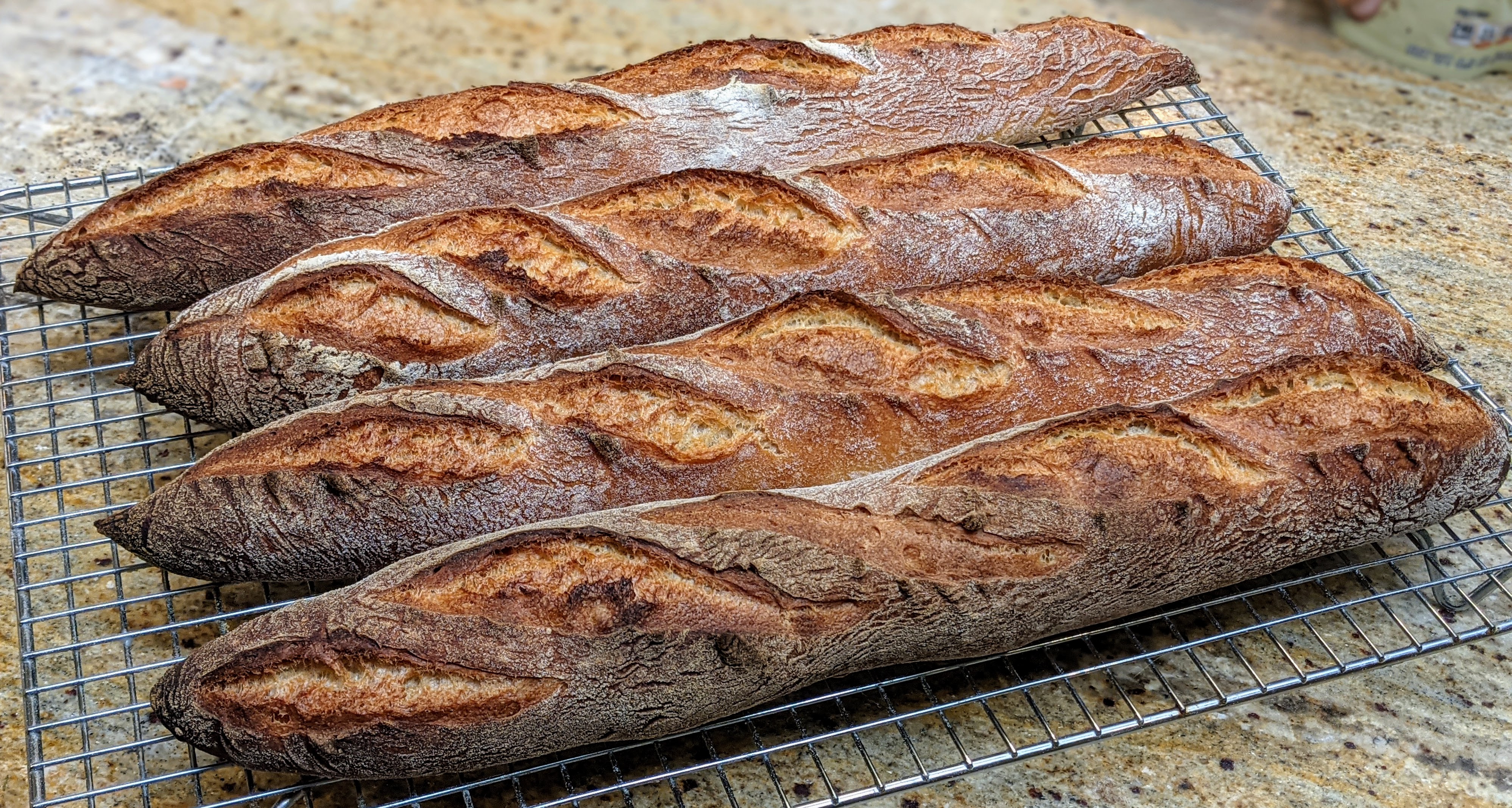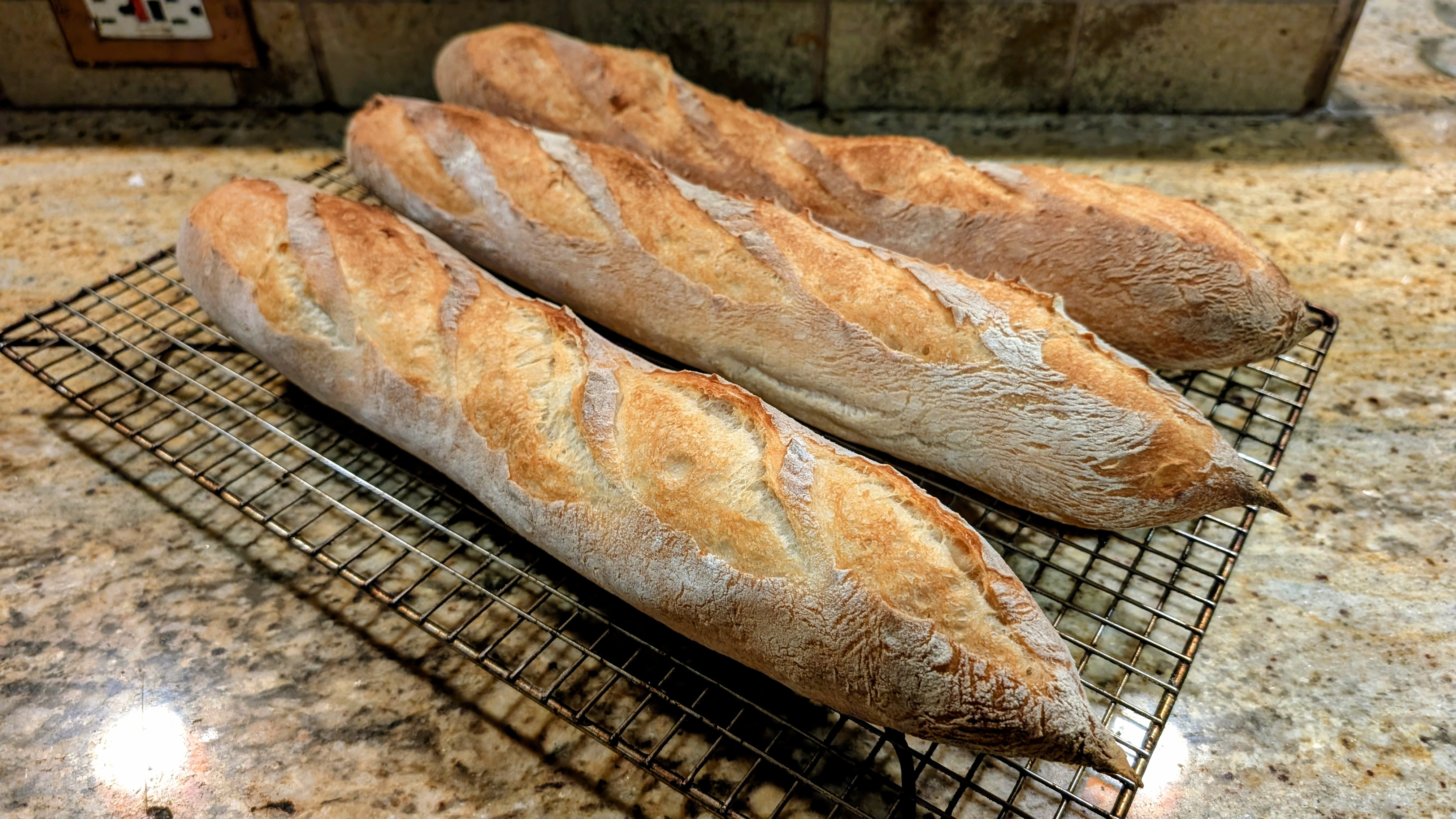 Bake. Score the baguettes then bake at 450°F. Bake with steam the first 10 minutes, then remove the steaming containers and bake until the crust is a deep golden brown. Mine took about 22 minutes to get to that point.