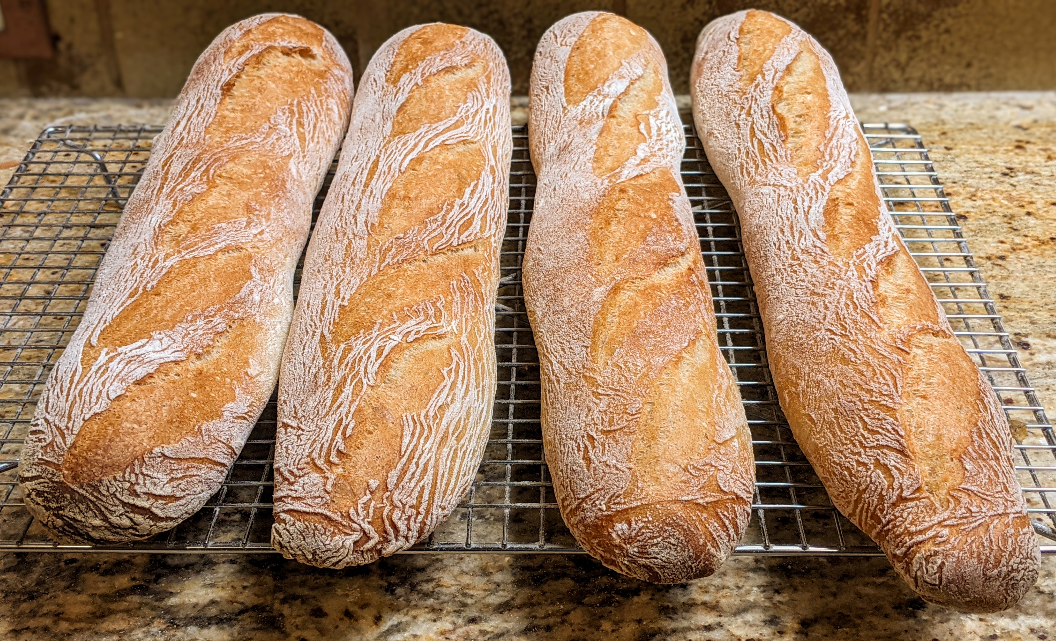 Bake. Bake at 425°F with steam for 20 minutes. Remove the steaming container after 20 minutes then bake at 400°F for 20-30 minutes to cure the loaves and reduce moisture in the crumb.