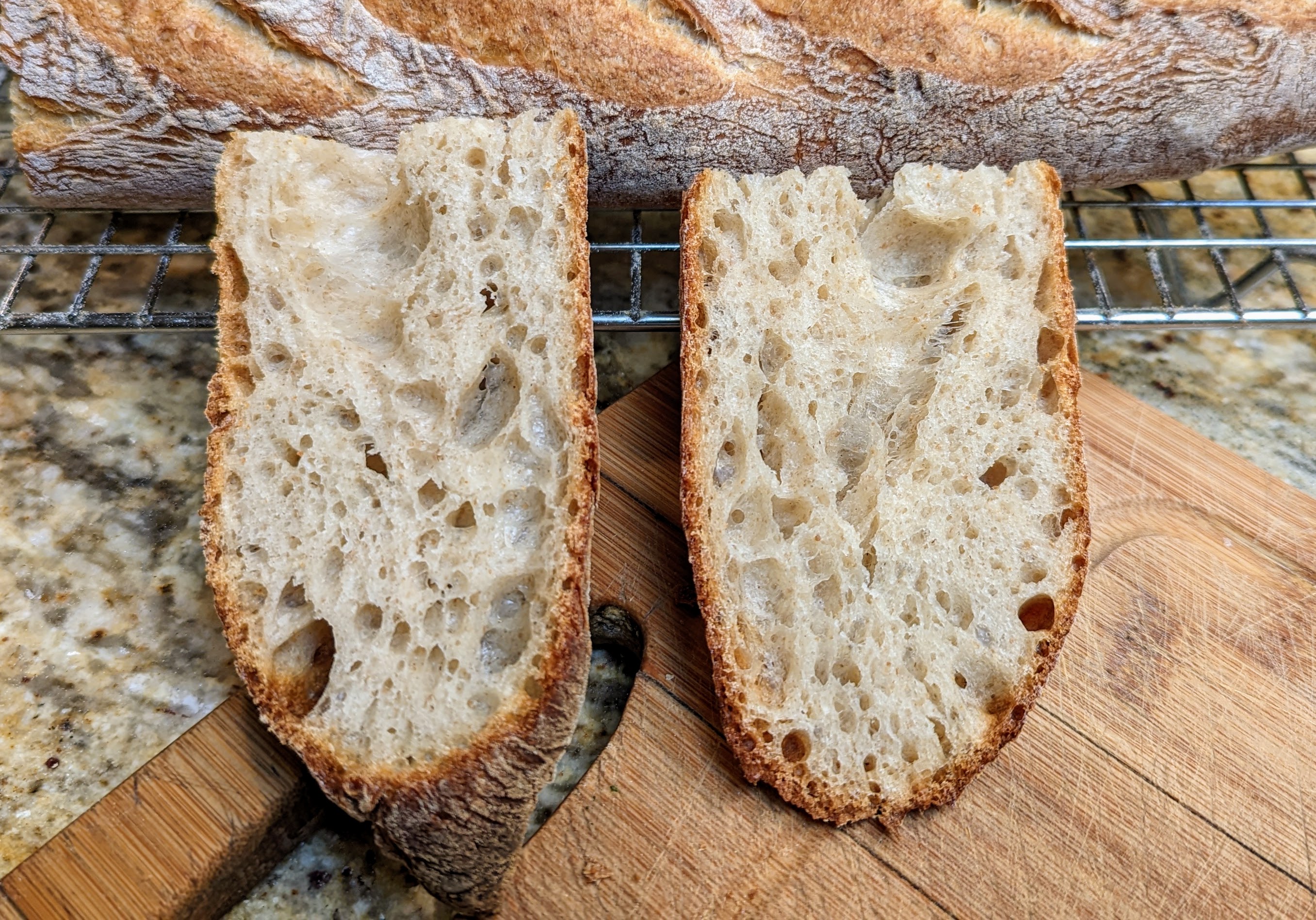 As much as I love baking with KamutTM, my normal supplier has been out of it for some months now. But what they have had in stock is dark rye flour. So for the past few months I’ve been experimenting with it and trying to find a good ratio. Like KamutTM, rye flour doesn’t form gluten. They’re both high in protein, but their proteins are more gelatinous in the presence of water as opposed to forming chains. Needless to say, they don’t add to the structure of the dough.