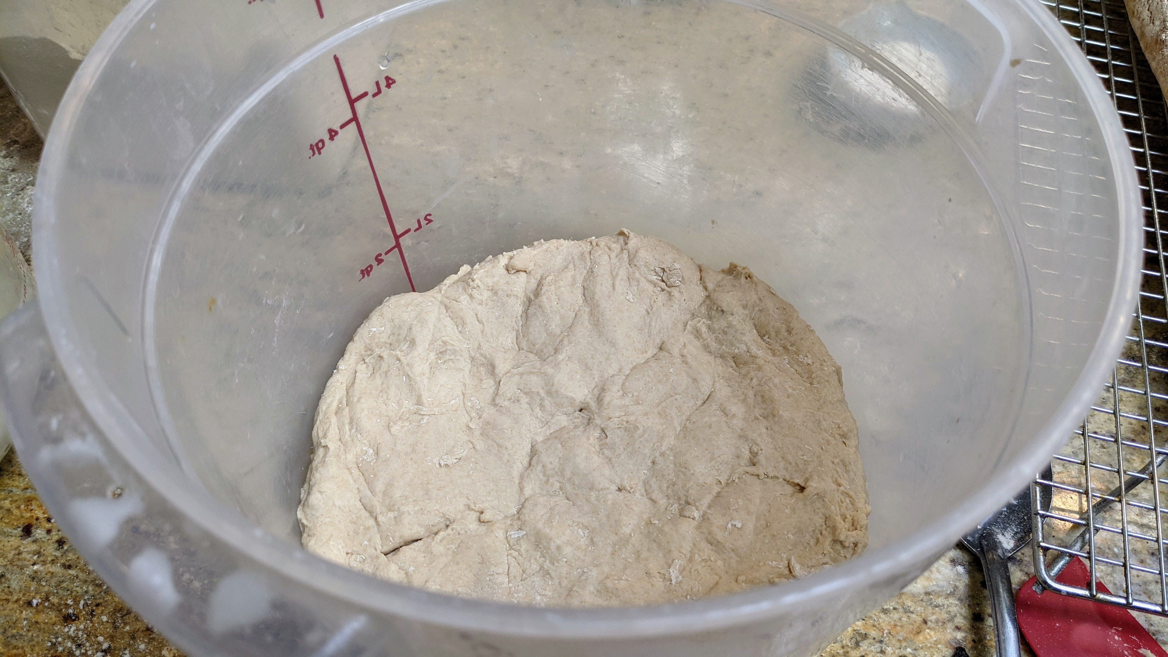 Once I dialied in the dough’s consistency, I transferred it to my bulking container to autolyse for 30-45 minutes. After that’s done, I’ll add the salt and a little more liquid to get to the approximate hydration (feel) that I want. There’s whole grain Kamut in this flour, so I’ll probably go a little wetter with the final dough.