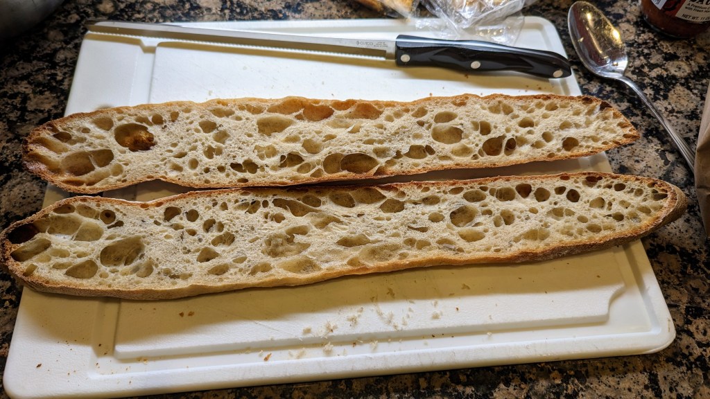 These turned out a lot better than my previous forays. And part of that – I think – is due to the baskets I used. I watched some videos of both Tartine and several other bakers that were making high-hydration oval loaves and they all used what appeared to be 14″ baskets. So I got a couple. I think it makes a difference as it allows the dough to expand. But I won’t be absolutely sure until I make loaves using a standard oval basket and a long basket at the same time.