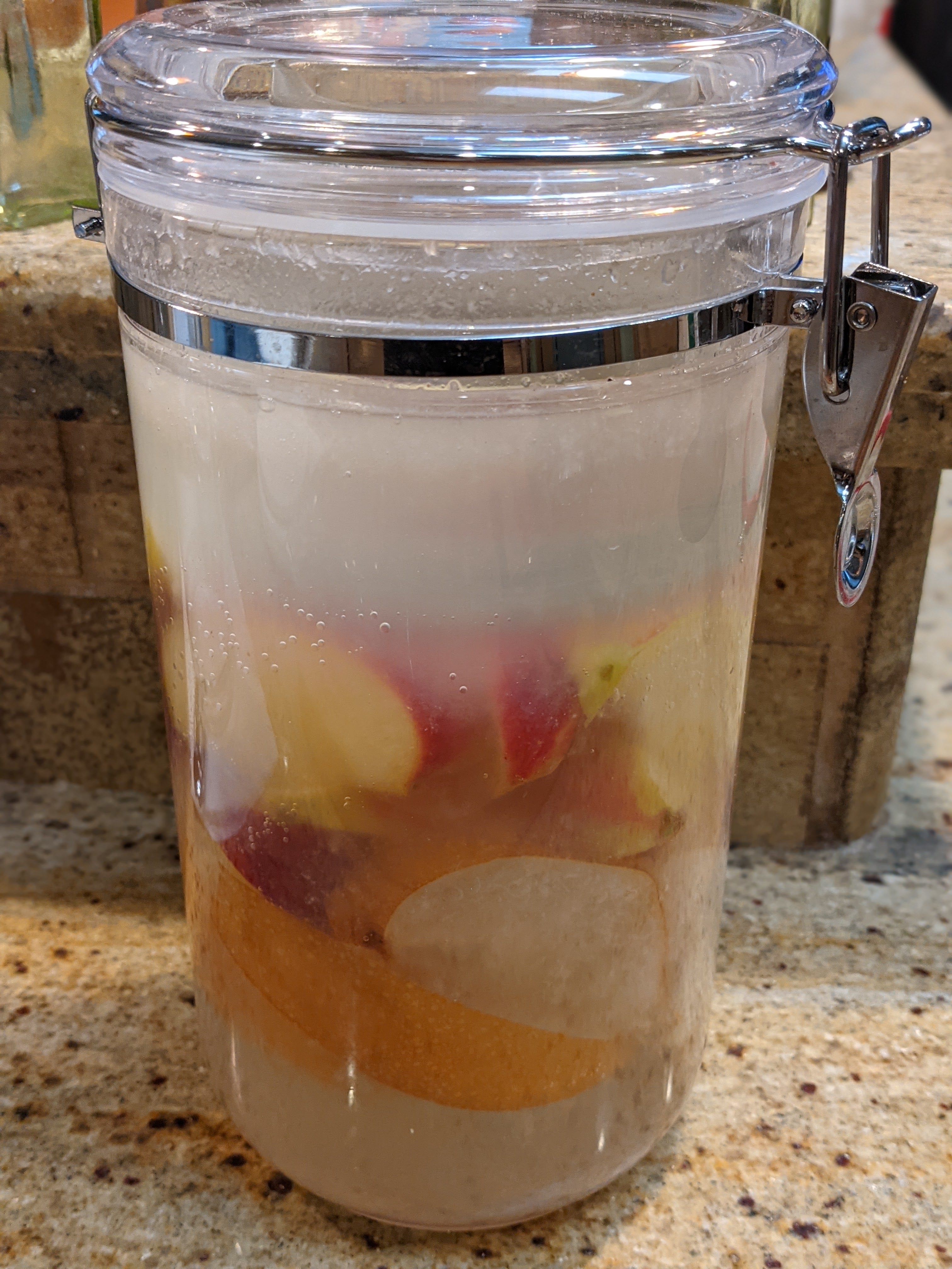 I used two apples and a large Asian pear for my ferment. Paul Barker recommends starting with apples in his book because of the natural sugars they contain that will feed the yeast.